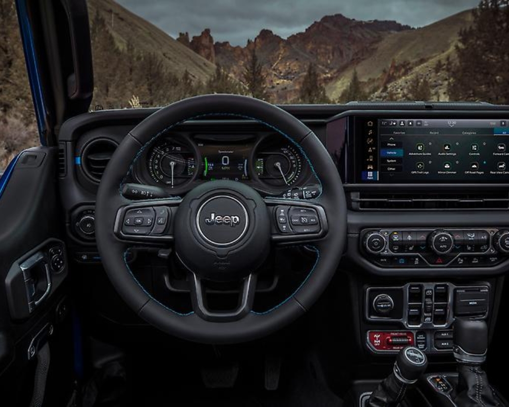 Inside, the Jeep Wrangler 4xe marries ruggedness with luxury. Available 12-way power-adjustable front seats, a new instrument panel, and the segment-leading 12.3-inch touchscreen infotainment system with wireless Apple CarPlay and Android Auto offer a tech-forward cabin experience that doesn't compromise on comfort or functionality.
