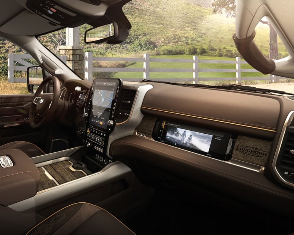 The 2025 Ram 3500 offers the most advanced tech ever seen in a Ram heavy-duty model. The standard touchscreen grows with higher trims, offering an 8.4-inch or optional 12-inch digital instrument cluster. With split-screen functionality, you can view navigation, towing details, and media simultaneously.