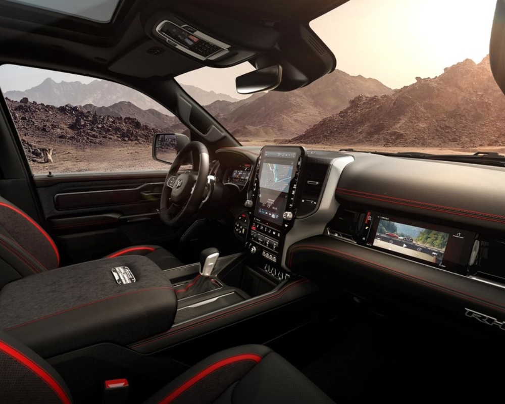 Step inside the cabin, and you’ll quickly see why Ram calls the 2026 1500 the most technologically advanced truck in its class. The centrepiece is the Uconnect system with a massive 14.5-inch touchscreen, which not only handles entertainment and navigation but also supports split-screen viewing so driver and passenger can run apps at the same time. Passengers even get their own 10.25-inch interactive display, giving them access to navigation, cameras, and streaming. The driver benefits from a 12-inch digital cluster display and an available head-up display, both designed to keep important information in sight without distraction.